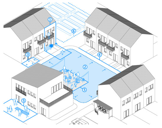 The central positioning of shared communal space surrounded by private dwellings, typical of most cohousing developments, creates distinct private-communal gradients, similar to, yet distinct from, the public-private gradients within most conventional housing developments (Figure 4, (1)). Ruiu [85] and McCammant et al. [83] observed that the boundaries between the private and communal spaces in cohousing are uniquely thin or soft in comparison to conventional public-private residential gradients (Figure 4, (4)). Higher levels of social interaction, participation in community life, trust and familiarity between residents allow the definition between cohousing residents’ private spaces and communal spaces to become more ambiguous. In cohousing, the social blurring between communal and private is reinforced spatially by community agreements that ensure that members keep their front gardens unfenced or free of hedges and gates.