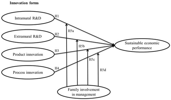 On the other hand, some researchers [4] also point out that sustainable economic performance is contingent upon a set of managerial (e.g., risk management), operational (e.g., reduction of inputs) or economic (e.g., innovation) factors, that is, variables that contribute to the achievement of firms’ long-term performance. Concretely, innovation has been identified as one of the most valuable sources of sustainable competitive advantages [12,13], enabling firms to grow and evolve even faster, survive and endure over time in rapidly changing environments, be more efficient in managing firm resources and ultimately, achieve superior performance outcomes [10,14]. However, innovation also constitutes a multifaceted phenomenon and therefore, its influence on long-term performance cannot be evaluated as a sole variable [15,16]. Thereby, it is analyzed how different innovation forms, i.e., intramural R&D, extramural R&D, product innovation, and process innovation, encompassing both innovation inputs and outputs, impact on sustainable economic performance. Even though some efforts have been made in prior studies to understand how innovation, and specifically, different innovation forms, such as information technology, organizational, or marketing innovations, impact on sustainable economic performance [5,12,17], the results obtained up to now are scarce and far from being conclusive. Moreover, there is also a lack of studies examining specific factors that may moderate the relationship between innovation forms and long-term performance. Therefore, in a further attempt to delve into such links, this article introduces family involvement in management as a firm strategic factor, which may improve the influence of alternative innovation forms on sustainable economic performance.