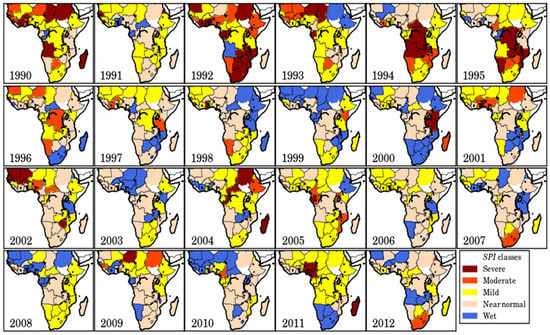 The SPI-based spatial and temporal distribution of yearly drought exposure during 1990 and 2012 showed many drought events in all SSA countries with higher severity from 1990 to 1999 as compared to the period 2000–2012 (Figure 1). Between 1990 and 1995, almost all countries experienced drought events. The most severe intensity in Southern Africa occurred in 1992, in Central Africa during 1994–1995, and in Western Africa in 1990. From 1996 to 2012, less severe drought events were recorded. The severe droughts were only observed in countries of Western Africa in 2002 and Eastern Africa in 2004. Other countries mostly experienced mild to moderate droughts (Figure 1).