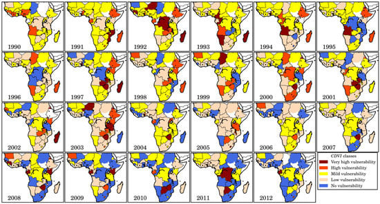 During 1990–2012, CDVI showed similar temporal trends as SPIs, as both indices showed more severe drought and higher vulnerability during 1990–1999 as compared to 2000–2012. However, the two indices displayed different pictures in terms of annual severity, revealing that different countries had varying resiliency during drought events. The Southern African countries were less affected by extreme CDVI, especially after 2000, indicating higher resiliency. For example, the moderate drought in 2012 in South Africa (Figure 1) did not cause the same level of vulnerability (Figure 2). The 2011 drought, which occurred in most SSA countries (Figure 1), had different vulnerabilities in different countries (Figure 2). An opposite situation occurred in 1999 when a moderate vulnerability in Western Africa was seen despite a non-drought situation.