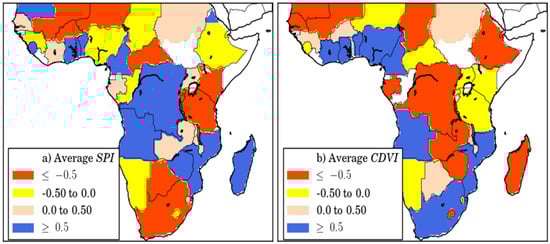 Overall, based on SPI classification, Southern African countries, as well as Kenya, Tanzania, and Ethiopia from Eastern Africa, Mali, Niger, Nigeria, Botswana, Chad, and Central African Republic were more prone to severe droughts whereas Central African countries and Madagascar experienced less severe droughts due to the occurrence of higher rainfall (Figure 3a). However, CDVI showed a different picture as South Africa, Botswana, Mozambique, Nigeria, and Cameroon were less vulnerable (Figure 3b). The severity of vulnerability was lower than the severity of drought in countries such as Kenya, Tanzania, and Mali.