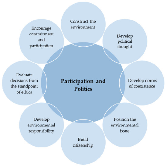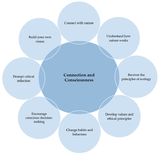 Based on the analysis of the teachers’ long-term purposes in including environmental issues in their practices, the following categories were identified: “connection and consciousness”, “participation and politics” and “re-thinking education”. Figure 1, Figure 2 and Figure 3 show the contents of each category, which are also summarized in Table 1, with an emphasis on the key dimensions proposed by Sandell et al. [66].