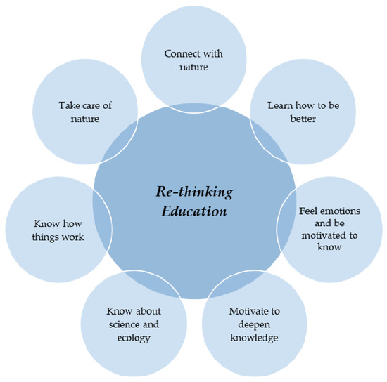From an environmental education perspective, this crisis has been linked to traditional educational perspectives developed and implemented around the world in recent centuries. [3]. In the face of the current socio-environmental crisis, the role of education is, therefore, key to addressing the necessary changes, and the field of education faces the enormous challenge of joint reflection in order to offer multiple alternatives to face this crisis. However, the urgency of the crisis means that some approaches to environment-related education have distanced themselves from the basic questions of education and its purposes and aims [4,5,6]. The attention given to this distancing is important at all levels, but particularly as a framework for investigating contextualized educational practices in which these fields show different values and meanings.