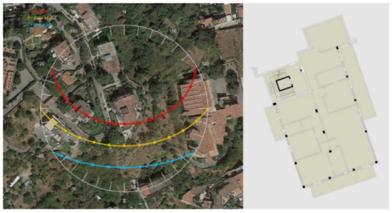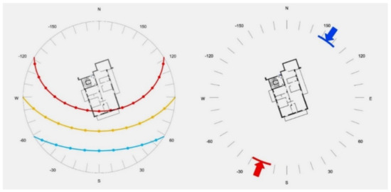 Figure 4 shows the solar diagram for the reference latitude, enlarged to a wider area, so that the orientations and obstructions on an urban scale are clear “SunEarthTools”, a free online program, was used for the simulation. The building, which has an almost rectangular shape, is roughly oriented with the longer side in the direction of S/SE-N/NW. This position is not optimal because it tends to not take full advantage of the sun during the winter period while being subjected to strong summer radiation, especially on the lateral fronts (