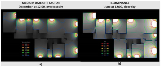 The calculations carried out to correctly assess the lighting primarily related to the quantification of the average daylight factor, that is, the minimum amount of daylight required in each indoor environment and, subsequently, the verification of the illuminance, or the maximum amount of internal lighting, so as to verify the possible presence of glare phenomena. The graph with the isolines made with VELUX Daylight Visualizer software shows how many rooms present very low daylight factors, even in those spaces characterized by a fair level of the daylight factor (DF), as there are pockets completely lacking adequate lighting (