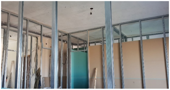 Dry partitions consisting of a thermal break frame and pressed earth panels. Inside, insulating panels were inserted (thickness of 5 cm, density of 40 kg/m