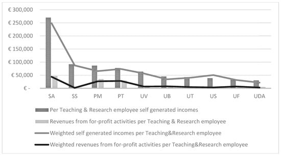 The economic differences from one geographic area to another can influence productivity assessments []. It is reasonable to assume that universities based in regions with higher GDP per capita have greater opportunities to attract financial resources from local and regional governments as well as from private companies; these universities are also potentially more attractive to students. Rather than being more virtuous, these universities may simply benefit from an ingrained competitive advantage. Weighting the ratios by regional GDP can mitigate this effect (i.e., Ratio × 1/Regional GDP per capita/National GDP per capita). The results of this analysis are given in Figure 1, where research-oriented universities (SA and SS) and the technical universities confirm their proclivity for financial autonomy. US operates in Sardinia, the weakest region among those considered in this group: By weighting its ratios, it was possible to give it a higher rank.