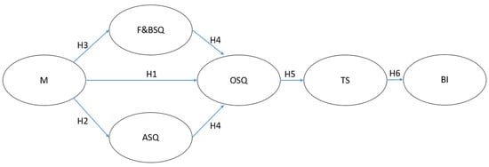 The proposed research model. Note: M = Motivation; ASQ = Accommodation Service Quality; F&BSQ = Food and Beverage Service Quality; SQ = Overall Service Quality; TS = Tourists’ Satisfaction; BI = Behavioral Intentions.