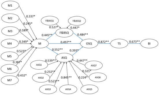 Results of structural equation modeling analysis. Note: M1 = Escape; M2 = Eustress; M3 = Aesthetics; M4 = Self-esteem; M5 = Group affiliation; M6 = Entertainment; M7 = Family; M = Motivations; ASQ = Accommodation service quality; ASQ1 = Farm tangibles; ASQ2 = Room cleanliness and comfort; ASQ3 = Parking; ASQ4 = Noise level; ASQ5 = Security; ASQ6 = Location; ASQ7 = Pleasant stay; F&BSQ = Food and beverage service quality; F&BSQ1 = Physical environment; F&BSQ2 = Food quality; OSQ = Overall service quality; TS = Equestrian tourists’ satisfaction; BI = Behavioral intentions. * p < 0,.05; ** p < 0.01.