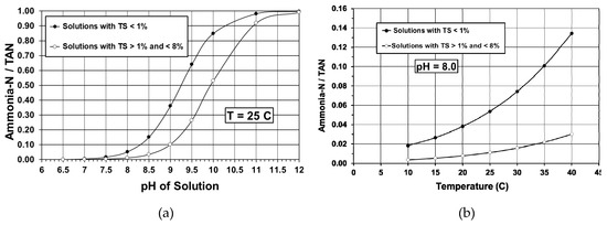 Impact of pH (a, temperature held at 25 °C) and temperature (b, pH held at 8.0) on the fraction of total ammoniacal nitrogen (TAN = NH4+-N + NH3-N) in ammonia form for liquid animal manure (adapted from Denmead et al. [24] and Zhang [25]).