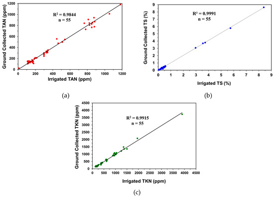 Comparison of irrigated and ground collected concentrations of TAN (a), TS (b), and TKN (c) for irrigated manure.