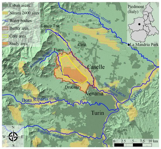 The metropolitan city of Turin in Piedmont (Italy), comprises 2,269,120 inhabitants, with an area of 682,691 ha, comprising 19.8% green areas—4.5% of which are protected natural areas []. La Mandria Park is a regional protected area since 1978, located between the Stura di Lanzo stream, the Ceronda stream and the northern part of the Turin urbanized area (Figure 1).