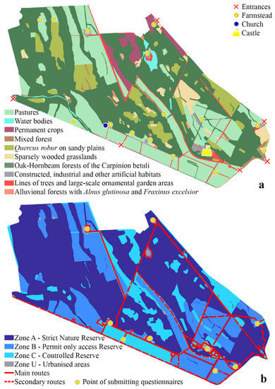 Land use and main elements (entrances, farmsteads, church and the castle) that characterize La Mandria Park (a) and levels of protection divided by zones (A, B, C, and U) and routes available (of different sizes) within the park (b).
