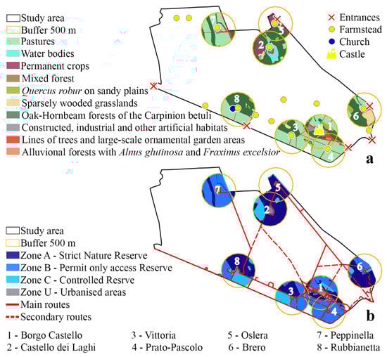 Land use in the eight buffers related to favorite places (a) and levels of protection divided by zones (A, B, C, and U) (b). The main cultural elements and routes were reported.