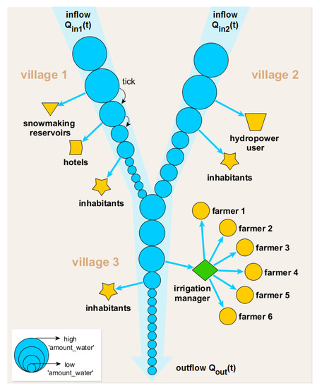 Ideally, Aqua.MORE complements an eco-hydrological model which represents the biophysical processes of energy and water fluxes in the catchment (i.e., soil-plant-atmosphere continuum). In the current version, the amount of resource input is generated externally, i.e., it is read in from one or more csv-formatted data files. In a future version, Aqua.MORE could also be directly coupled with either classic rainfall–runoff models or with eco-hydrological models representing the interplay between vegetation and water. Literature already provides examples for ABM applications being coupled with hydrological models, e.g., with the ‘Soil & Water Assessment Tool’ (SWAT) [23,39,40].