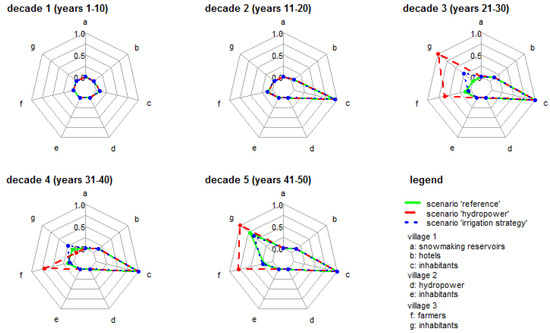 The consequences of the scenario ‘hydropower’, in which the hydropower user in village 2 starts water abstraction in decade 3, do not manifest in village 2 itself. The water abstraction of the hydropower user rather affects the farmers and inhabitants of village 3, which show a significantly higher mean relative scarcity compared to the scenario ‘reference’. As the inhabitants in village 3 suffer from high relative scarcity in decade 3, the irrigation manager is politically forced to decrease the amount of irrigation water for the next decade. This leads to sufficient water supply of the inhabitants in decade 4, but at the same time to an exacerbated water scarcity situation of the farmers. As the inhabitants are not subject to any scarcity in decade 4, the irrigation manager is allowed to increase the amount of irrigation water again in decade 5 by diverting more water units to the farmers. He/she thereby improves the water supply of the farmers, but at the same time triggers again a severe scarcity of the inhabitants. These results show a typical upstream–downstream conflict, which cannot be solved by adaptations of water use behavior in village 3 alone. The irrigation managers’ scope for action is limited in this case, as the total available water in village 3 is insufficient to satisfy the competing demands of farmers and inhabitants. A decision maker probably needs to address the problem at its source, namely in village 2.