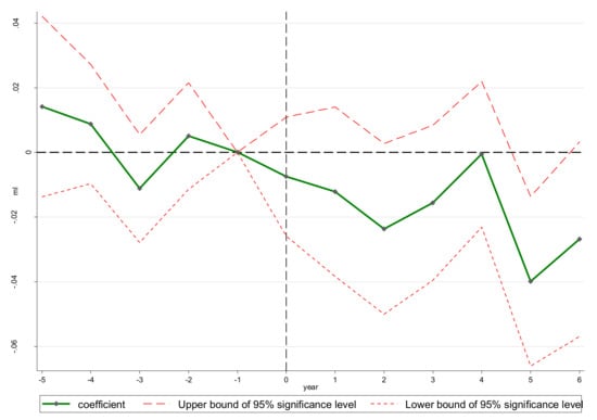 According to Table 1, 2004–2014 was the period during which SO2 levy standard reform in the provinces occurred. , in this model, identifies the time when the reform began. = 0 is when a province implemented PSR, = −1 refers to the year before implementing PSR, and = −2 is two years before implementing PSR. Therefore, = [−9, 7], other variables are the same as the benchmark model. This study followed Greenstone and Hanna [] and finally unified = [−5, 6] by excluding = −1, the year before publishing PSR, to serve as a comparison group. The aim is to obtain adequate sample size for parallel trend assumption and time effect analysis. The model also introduces L and R to replace other periods in order to estimate the average annual effect in the rest years.