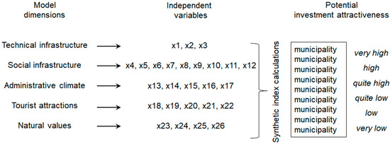 Potential investment attractiveness is a complex phenomenon, and its measurement requires the involvement of many indicators describing different location values [21]. The difficulty of measuring investment attractiveness lies in translating the theoretical term into a system of empirical indicators. The components (investment microclimates) useful for the research were determined using the algorithm of sums of zero unitarization [43], for which the appropriate empirical indicators were selected. The selection of indicators for the model was based on similar studies on the assessment of investment attractiveness [21,22]. In the next step, the indicators were standardized and then aggregated into individual microclimates. Finally, the microclimates were combined, and thus, synthetic indicators of the level of investment attractiveness were obtained. Due to the aim of the study, i.e., determining the relations between model components and actual investments, uniform weights for model indicators were used [44]. The aggregation process included the implementation of further activities: