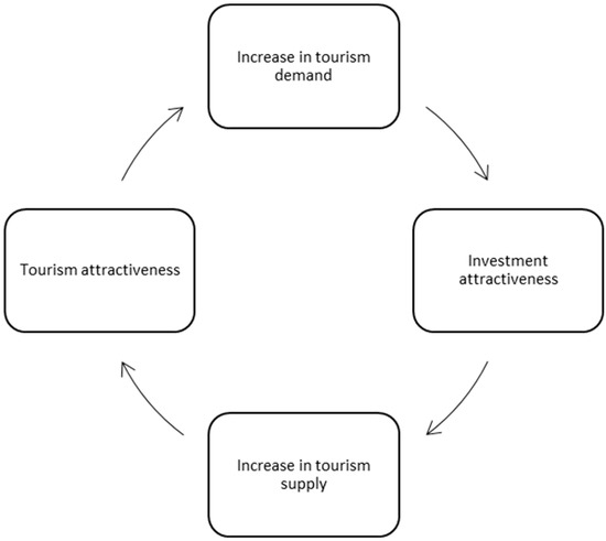 Despite the fact that the phenomenon of overtourism results from an excessive number of tourists, i.e., too high demand, in the case of many types of tourism this phenomenon can also be analyzed from the supply side. This is especially true for seaside holiday tourism. Massive investments related to the creation of new accommodation sites, restaurants, shops and entertainment facilities are largely responsible for tourist traffic in coastal towns. A vicious uncontrolled circle of tourism development is created, in which new investments stimulate the increase in tourist demand (Figure 5). The development of supply increases the tourism attractiveness of the place and encourages tourists to an increased number of trips. Exceeding the tourist capacity creates the aforementioned discomfort in both residents and tourists, as well as the local economic environment.