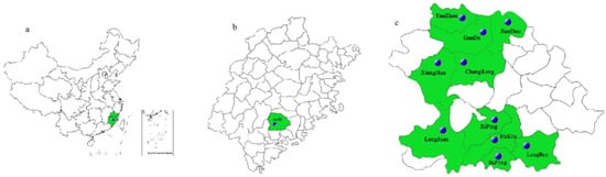 Map showing the geographical distribution of the ten main tea production towns of the survey. Adobe Illustrator Artwork 17.0 software was used to create the map. (a) Location of Fujian province in China. (b) Location of Anxi county in Fujian province. (c) The ten towns in Anxi county.