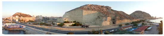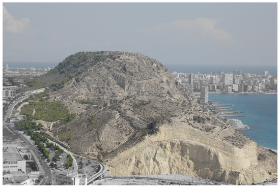 The Spanish Mediterranean coast, where the city of Alicante is located, is mainly clay [44]. In the urban center of the city are the two mountains compared in the study: Benacantil Mount and Serra Grossa. Therefore, they can be considered to have the same igneous composition [45,46].