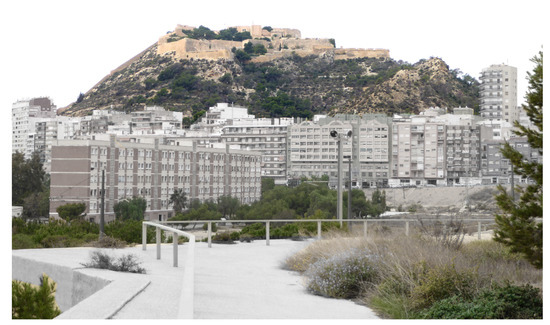 Benacantil Mount, due to its position, is the highest point in the center of Alicante. It is located in a privileged area due to its proximity to the sea and has an approximate height of 166 m where the Castle of Santa Bárbara is located [47,48], this being the highest construction object in the town center (Figure 3). This fortification, for its height and great view of the panorama, is the most important historical construction object in the city, which served as a defense in medieval times. At its origin, this construction was surrounded by a wall for the protection of its inhabitants, which has changed over the years due to the different armies that have controlled the fortification. On the south side of the castle is the Polvorín de la Ereta [49], a building used for guarding the weapons and ammunition of the city’s army.