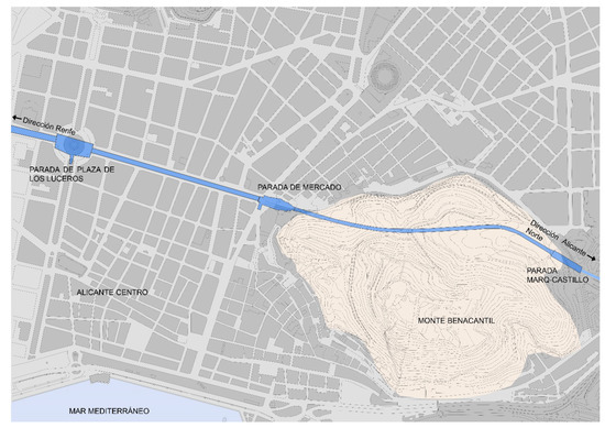 The Benacantil Mount railway tunnel is, together with the Serra Grossa tunnel, one of the most important civil works conducted in the 21st century in the city of Alicante. This infrastructure connects the Marq–Castillo stations, at the foot of Benacantil Mount with the Luceros Station, although in the future its pretensions plan to reach the Renfe Railway Station itself and serves as a connection to the city with travelers arriving from all over Spain. The route of the tunnel passes under Alfonso X el Sabio Avenue and Station and Jaime II Avenues until it enters Benacantil Mount (Figure 4), reaching a point fifteen meters below the street’s zero level.