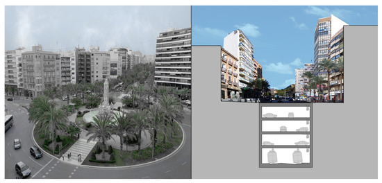 The railway infrastructure that, in the future, will connect the Renfe station with the northern area of Alicante had the problem of passing through one of the most important avenues (Alfonso X el Sabio), where road traffic is very dense in the heart of the city center. The project eventually proposed the idea of burying the tunnel and providing the city with parking on these large avenues, as shown in the photomontage of Figure 5.