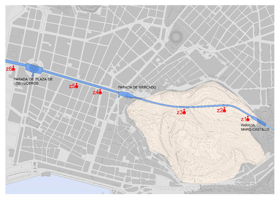 The tunnel has an average depth of 15 m and connects, through a 1700 m duct, to the TRAM stop points at the foot of the castle (Marq–Castillo), as well as Mercado and Luceros to the future Renfe stop, which, although not yet connected to tracks, the excavation has been performed. The survey sites correspond to the following areas within the tunnel, as shown in Figure 11.