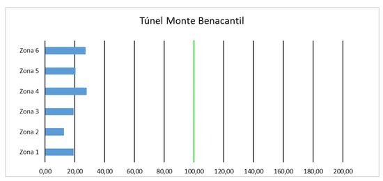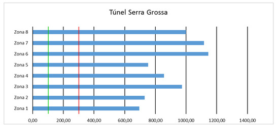 The study lasted eight days starting on 9 June 2016, and the cameras were placed by covering the length of the tunnel to provide data from different areas, depending on the composition of the terrain or the constructive form, with which the tunnel was made in each section, being different both in Benacantil Mount and the avenues of the city. Figure 12 shows the values obtained from the measurement.