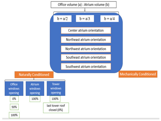 In this research, a methodology was adopted to produce the optimal atrium volume in a hot and humid climate. The simulation models used in this research were the single volume, medium-rise, and high-rise atrium buildings, which functioned as offices and are illustrated in Table 1. Accordingly, all of the dynamic models’ scenarios were analyzed based on three main proportions of the atrium volume at 1/2, 1/3, and 1/4 of the office volume, as can be seen in the general workflow of this paper in Figure 1. As the next step in all of the dynamic models’ scenarios, the atrium placement was changed between the center, northeast, northwest, southeast, and southwest for each model, as illustrated in Table 2. Furthermore, all of the above parameters were tested based on the different internal dynamics of naturally and mechanically conditioned systems. Moreover, the active strategy (mechanical condition) involved a basic air conditioning system in Famagusta buildings with extended hours when all of the building’s windows were completely closed during different seasons. Additionally, the passive strategy (natural ventilation condition) involved the application of different facade window opening ratios—0%, 50%, and 100%—to determine the most suitable models. The EDSL Tas dynamic thermal simulation software, version 9.4.4 [23] was used for this study.