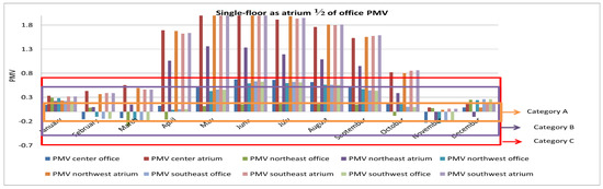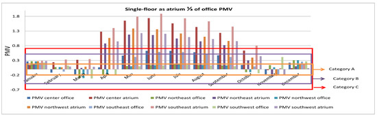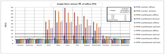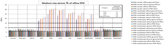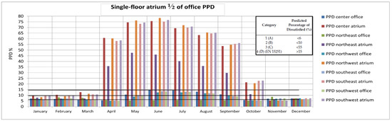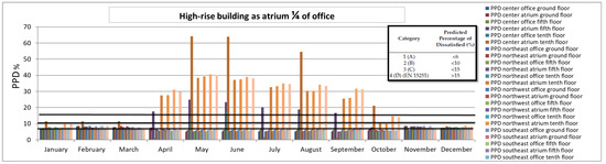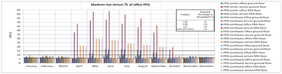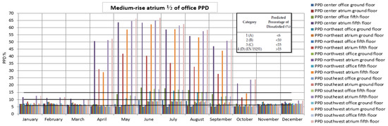 As illustrated in Figure 10, when the atrium volume was 1/3 of the office volume, it had a completely suitable internal thermal comfort in the office and atrium zones of the ground floor based on Category B throughout the year. Also, the thermal comfort of the upper floors of the last office zone from September to May was achieved according to Category C. The northeastern atrium placement in the whole of the ground floors was based on Categories B and C throughout the year, and based on Category C for the last office floor from September to May, which were all thermally comfortable. The northwestern, southeastern, and southwestern atrium placements in all of the ground zones and the last office zone had a thermal comfort condition based on Category B. As shown in Figure 11, the PPD of the aforementioned group with a southwestern atrium placement had the most negative condition in comparison with other simulation models using a central atrium placement.