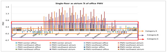 As shown in Figure 6 and Figure 7, when the atrium volume changed to 1/4 of the office volume in a single-floor with a central atrium placement, the office zone had thermal comfort during the year based on Category C, while the atrium zone had the worst internal condition from April to September with the other months’ thermal comfort based on Category C. The northeastern atrium placement in the office zone had thermal comfort from January to December according to Category A. Furthermore, the atrium zone in this group had thermal comfort (PMV) from November to March based on Category A, and Category C in April. The northwestern atrium placement office zone had acceptable internal comfort from January to December based on Category B, with the other months having comfort based on Category A. However, in the atrium zone, April to September had a negative internal comfort, while October to March had thermal comfort based on Category B. The southeastern and southwestern atrium placement office zones had an internal comfort condition throughout the year based on Category B, the same as in the atrium zones from October to March. Furthermore, the PPD of the atrium volume of 1/4 of the office volume with a central atrium placement had better user satisfaction (comfort) in the office zone based on Category C in terms of PPD. Additionally, the southeastern, southwestern, northwestern, and northeastern atrium placement office zones had thermal comfort based on Category C.