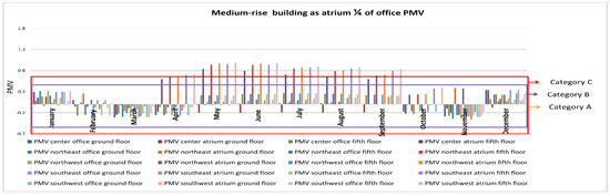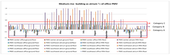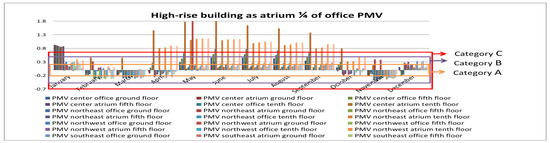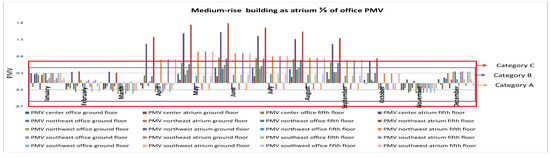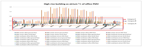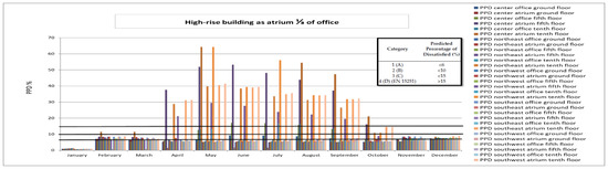 As illustrated in Figure 18 and Figure 19, when the atrium volume was 1/4 of the office volume in the dynamic thermal simulation models, PMV and PPD showed fluctuations in user satisfaction. For instance, office zones from February to December in the central and northeastern atrium placements had thermal comfort conditions relying on their mechanically conditioned system. The PPD of the ground atrium zone in the center atrium high-rise building (1/4 volume proportion) from May to August had the highest figure of all simulation models. However, the northwestern, southwestern, and southeastern atrium placements with the same parameters had an acceptable PPD based on Category A from the ground floors to medium floors, and close to Category B in the cold months. Also, the last office floor had a thermal comfort condition based on Category A in terms of PPD. The northeastern atrium placement of this group (1/4 volume proportion) in all building zones had a thermal comfort based on active performance according to Categories A and B. Furthermore, it is noteworthy that the medium-rise and high-rise atrium building (as an office function) dynamic simulations with the atrium volume 1/4 of the office volume and based on natural ventilation had a more acceptable indoor user comfort than other proportion model scenarios.