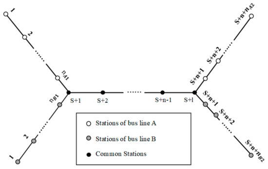 In this paper, we only consider the common corridor with two bus lines. The bus network is simplified into the model shown below (Figure 1). When two bus lines are in a common corridor, the number of common stops is n, and the stops are marked as