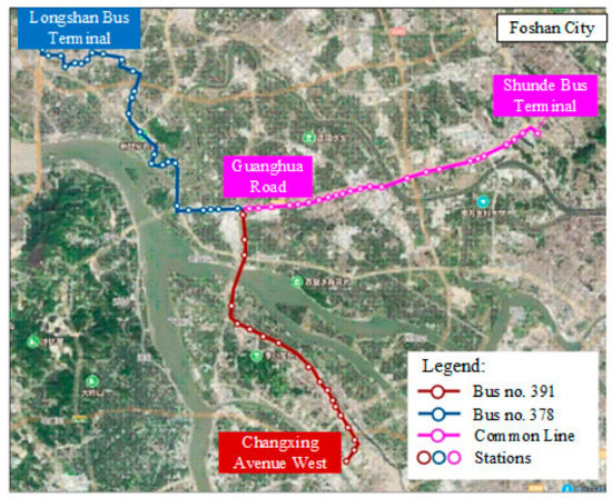 The experiment data in this paper are derived from the bus operation data of Foshan, Guangdong City. The cases of bus no. 391 and bus no. 378 with a common line segment and the obvious phenomenon of bus bunching are selected as the object in this paper. The direction and common route sections of bus no. 391 and bus no. 378 are shown in Figure 3.