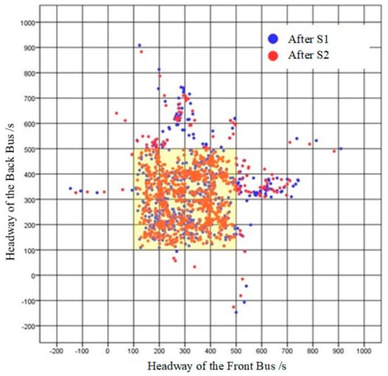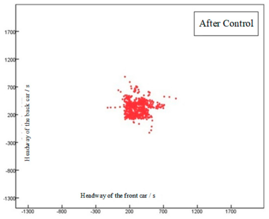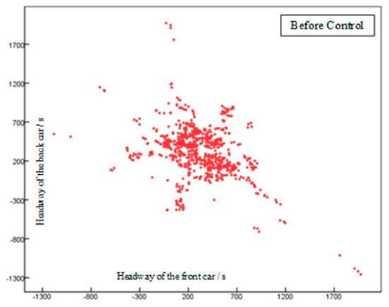 The headway of the original data shows a scattered state in Figure 6, indicating that the headway greatly deviates, and the bus operation is very unstable. While after the implementation of the holding strategy, headway converges towards the center (Figure 7), indicating that the headway becomes stable.