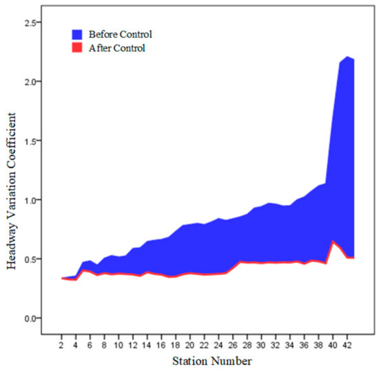 Calculate the time headway variation coefficient of each station (Table 2) and a comparison diagram is shown in Figure 8. It can be seen from the figure that after the implementation of strategy, the headway variation has been significantly reduced, which indicates that the probability of bus bunching is reduced.