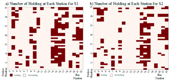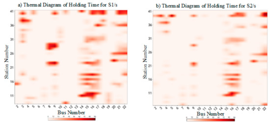 In order to reduce the unnecessary long time of holding, a coefficient ( is introduced and h is the minimum allowable headway. Only when the distance between two buses is smaller than h can the holding strategy be implemented. Previous studies show that the range between 0.6 and 0.8 is relatively appropriate [54]. So, a medium value of 0.7 is taken for in this paper. The holding strategy means the extension of the bus stopping time at the station, leading to the prolonging of passenger waiting time in the cars. However, the waiting time that passengers can endure in the car is limited. Therefore, a maximum allowable holding time is set in this paper. The value of is set as 90 s according to Reference [55].