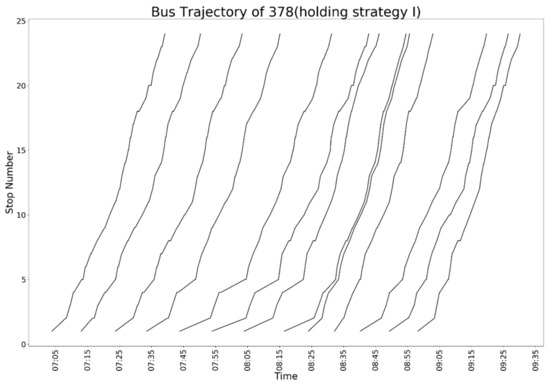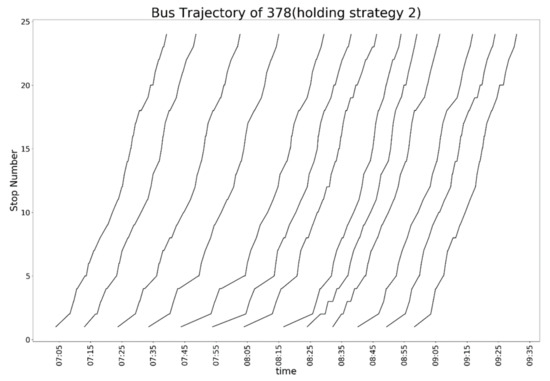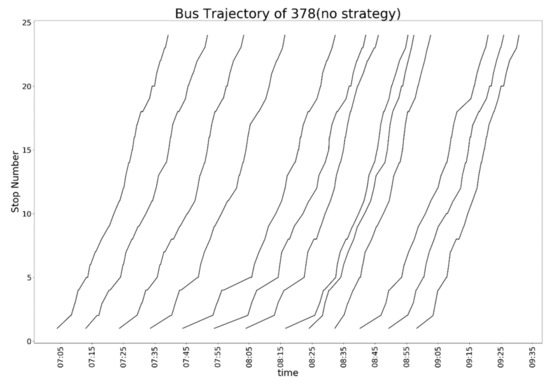 Through the comparison between the running trajectory after the implementation of S1 and S2, as shown in Figure 14 and Figure 15, we can see that the bus trajectory of S2 is more even. This is because that S2 aims at stabilizing the headway of bus no. 378 as well.