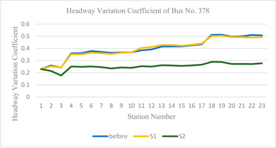 According to Figure 16, after the implementation of S2, the headway variation coefficient of bus no. 378 decreased significantly, indicating that the reliability of bus no. 378 increased. It proves that the implementation of S2 not only improves the phenomenon of bus bunching of bus no. 391, but also increases the operational reliability of bus no. 378.