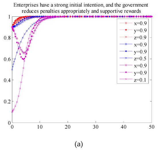As is shown in Equation (7), if , the ESS of enterprise A choosing cooperation strategy is , which means that when the probability of enterprise B choosing cooperative strategy is low to a certain degree, enterprise A also tends to choose non-cooperation strategy so as to combat enterprise B’s “free-riding” behavior. However, when the probability of enterprise B choosing “cooperative” strategy is high enough, enterprise A will choose “cooperative” strategy in order to avoid government penalty and obtain cooperative benefits and government rewards.