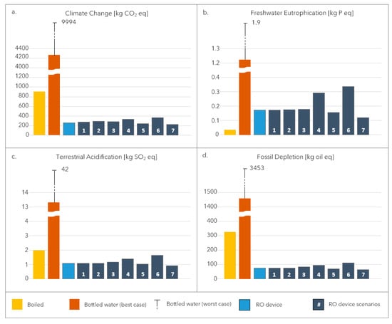 Figure 3 shows the results of the sensitivity analysis. Due to the conservative choice of baseline scenario for bottled water, all other bottle scenarios resulted in impact increases (Figure 3 only includes and error bar for the maximum result; full details can be found in Table A6). Despite the wide choice of favorable and disadvantageous scenarios for the RO device, the overall conclusions from the impact analysis remain unchanged. Even for terrestrial acidification (Figure 3c), where it had been concluded that the difference between boiled water and RO device was within the same range, the most favorable scenarios for the RO device do not increase significantly the difference between the systems.