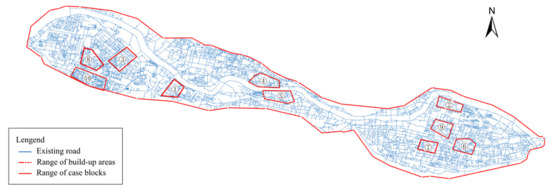 Lanzhou City has the typical strip characteristics of valley cities. In order to fully reflect the impact of valley characteristics on urban road network, we selected 10 case blocks under the condition of spatial syntactic characteristic parameters based on the research results of road traffic network structure in Lanzhou City [49,50]. Meanwhile, in order to study the influence of the unique valley terrain on the results, we selected five blocks along the river and five blocks within the city for comparison. The length of each side of the block within 1–2 km, covering different city functions. The location of these blocks is shown in Figure 1. Among them, blocks 1–5 are located along the valley, and blocks 6–10 are located within the city.