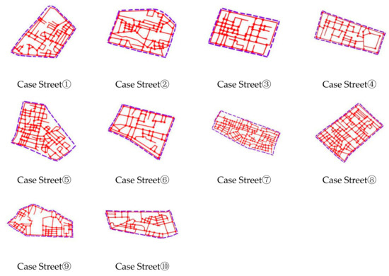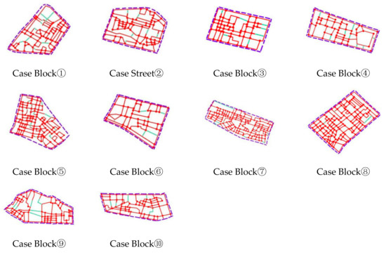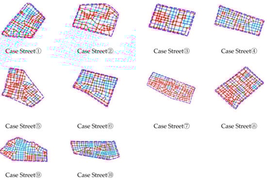 The maximum block length is generally between 86 and 170 m [51]. Under this condition, the inner road networks of the selected blocks are gridded, and their topological structure diagrams are shown in Figure 3.