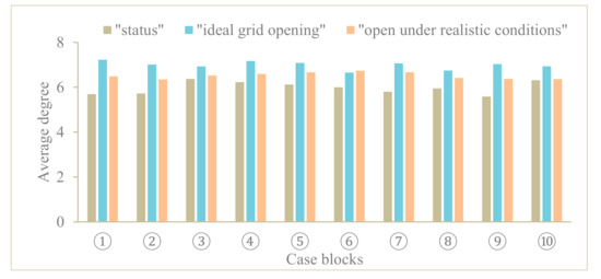 Figure 5 shows the average degree of the case blocks in three cases: the “status”, “ideal grid opening” and “open under realistic conditions”.
