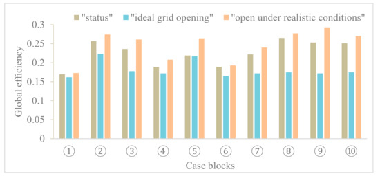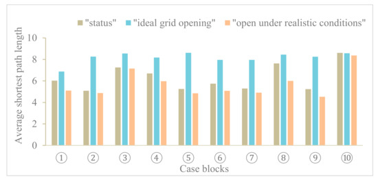 Figure 6 shows the average shortest path length of the case blocks in three cases: the “status”, “ideal grid opening” and “open under realistic conditions”.