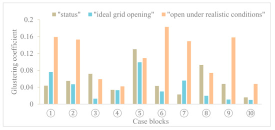 Figure 7 shows the clustering coefficient of the case blocks in three cases: the “status”, “ideal grid opening” and “open under realistic conditions”.