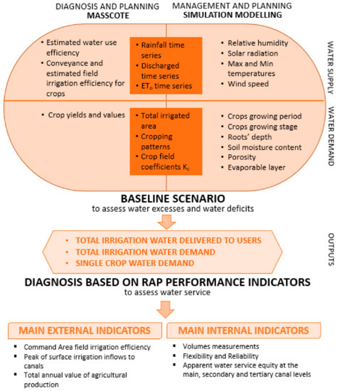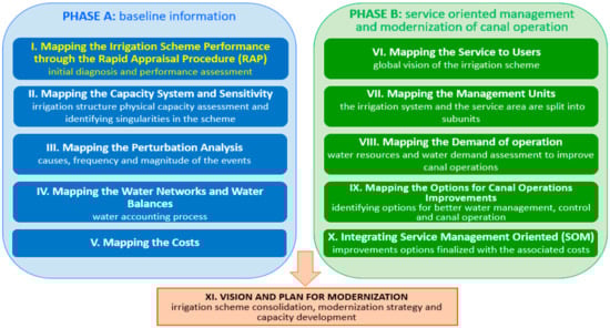 Water management and decision-making processes are necessary building blocks to sustainably manage and to provide an adequate balance on water supply and water demand [25]. In order to keep informed decision makers, assessment of baseline conditions is of paramount importance. The Mapping System and Services for Canal Operation Techniques was the methodology on which the knowledge-based DSS was focused. The MASSCOTE methodology (Figure 2) is a step-by-step framework to generate optimal strategies for irrigation management with the objective of facilitating a more effective water management and water delivery service [26]. The core of the MASSCOTE approach was the canal operation through two major steps: Diagnosis phases and development of modernization plan.