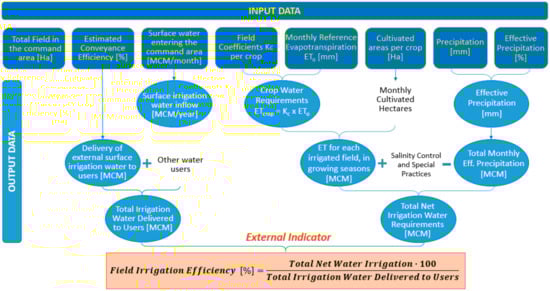 The DSS integrates the MIKEHydro Basin model in the MASSCOTE approach via the first step of Phase A. In the knowledge-based DSS, the rapid appraisal procedure (RAP) was combined with MIKEHydro Basin model. Currently, the diagnostic process of RAP is performed on spreadsheet basis to establish systematic assessment of the irrigation scheme performances at multi-management layers. The three principal objectives of the RAP are (i) the rapid evaluation of key performance indicators, (ii) knowledge acquisition for modernization strategies, and (iii) the baseline assessment in sequential manner, against which progress can be measured. External and internal indicators provide a comprehensive overview about efficiency of water use, management, and received water services. Internal indicators provide a detailed perspective of the existing operational conditions of the scheme and the water delivery service. External indicators are necessary to assess the possibility of conserving water and improving water management in line with agricultural conditions and practices. When considering irrigation scheme management and design, the main purpose is to guarantee an efficient use of water, as well as the optimum crop production. For over four decades, performance indicators, usually called efficiencies, have been applied according to the objective of the assessments [27]. In the current context, field irrigation efficiency was considered as the principal indicator of water use efficiency. By applying a water balance calculation, it incorporates the effective precipitation and water supply against ET-based crop water requirements (Figure 3).